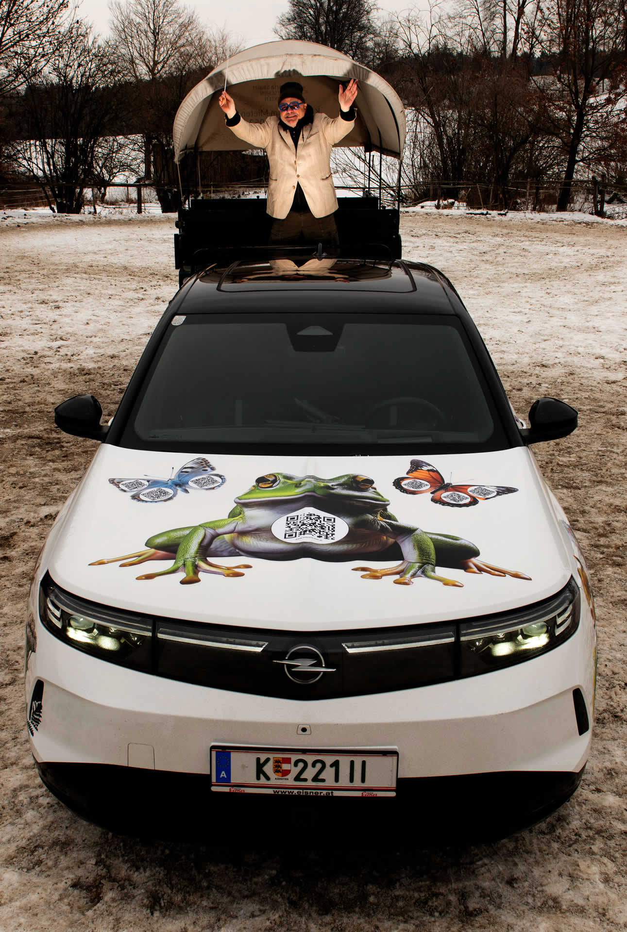 Das Konzept „hoochzeiten“, das er auf Bitte der Stadt Klagenfurt auf der Halbinsel Maria Loretto umsetzte. Die Idee: Picknicken im Freien. Dafür baute er mit Künstlern einen überdi­mensionalen barocken Bilderrahmen, durch den sich die Leute fotografieren lassen konnten. Die KI: „Den Bilder­rahmen ließ Bürgermeister Harald Scheucher um 1500 Euro an die Ge­meinde Treffen verscherbeln, deren Vizebürgermeister zufällig im Kon­trollamt Klagenfurt beschäftigt war. Die Kärnten Werbung versuchte, die Idee zu kopieren – allerdings nicht gerade professionell.“